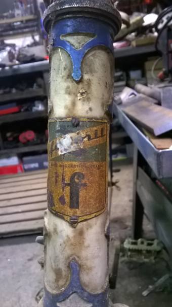 Tak by to měl být rok 51 nebo 52. Kola původní nejsou, mělo to původně galusky a ty se na vesnici kde to jezdilo asi moc neuchytily tak je někdo vyměnil za modernější plášťová. Sedlo bych řekl že je tak půl na půl, poradím se sedlářem co s ním a uvidíme. Jinak rám bych chtěl zachovat tak jak je, jen očistit, odstranit některé části od jiných barev něž původních a přeleštit. Ostatní části zabavit rzi a pak je nějak chemicky ošetřit, chrom, nikl… zatím nevím co tam původně bylo. Z pedálů mám radost, protože na většině kol z té doby jsem je opravdu nikdy neviděl. Velká škoda je, že někdo uřízl původní držáky na pumpičku, aby tam mohl dát delší.