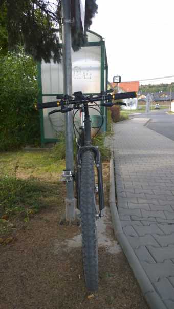 Výsledek pokusu podívat se na mapu v mobilu při ploužení se za párem pomalých cyklistů. Ženská přede mnou místo normálního ukázání a odbočení v 15 km/h kdovíproč najednou vzala za brzdu – já teda taky, abych do ní nevrazil, a už jsem nestihnul vrátit pravou ruku zpět na řídítka, abych nepřeletěl :-D Mobilu se nějakám zázrakem vůbec nic nestalo, mně taky ne (až na pár modřin), kolo viz foto – po pádu jsem se na silnici nechtěl moc zdržovat, a tak jsem na toto přišel až asi po kilometru, kdy jsem si také všiml chybějících světel. Než jsem se stihl vrátit, obě světla byla samozřejmě auty rozmačkaná – z předního přežila elektronika, za zadního jsem našel pouze baterie. Mimochodem, cyklisti ujeli, ani se nezeptali, jestli jsem v pořádku…