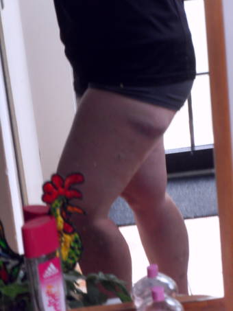Dnešek jako že výživnej, ale ty pláště musí z kola, fakt nedržej. V zatáčce kde bylo hodně kořenů mi to slušně podjelo a já tak v 25 km/h sebou flákla stehnem a prdelí přímo na ty kořeny. Dobrých pár minut jsem byla přesvědčená, že jsem si zlomila stehenní kost, naštěstí z toho je jen tato omalovánka :-) Ale barvičky neladí, příště bych to prosila bez nich.