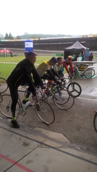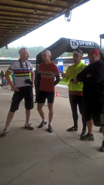 Zlínský tým. Zprava ,servisman, ředitel týmu, jezdec v jednodenním angažmá, za bariérou masér, taktéž zdatný moderátor, a zkušební jezdec.