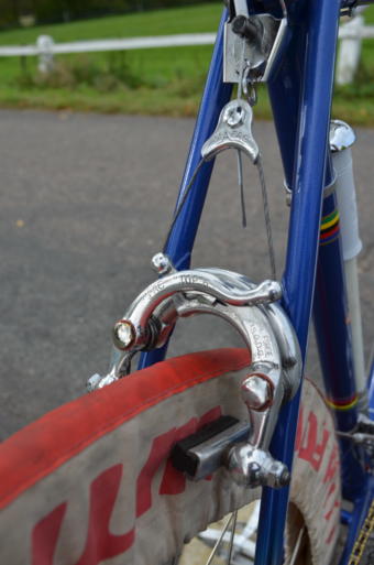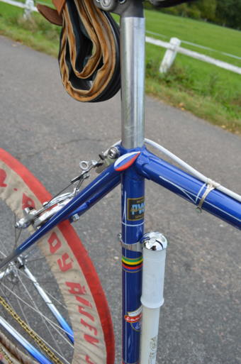 Tak se ke mě dostal zase jeden rám F1 z roku 1964. Bohužel v nepůvodním laku. Takže zase kompletní práce. Chrom jsem si nechal udělat, zbytek jsem dělal sám. Za povšimnutí stojí dvě vypilované drážky při vstupu sedlovky do rámu. Za tu dobu co se Favoritům věnuji, jsem si na lepších kouscích z šedesátých všiml české vlaječky na seříznutém salámu zadní vzpěry, tak jsem se o ní pokusil. Pětikolečko jsem použil ze současné produkce, protože jsem před pár dny absolvoval na jeho bratříčkovi Ten chromovanej Kokořínskou klasiku a tam se mi původní pětikolečko Velo vysypalo. Je to prostě spotřebák. Dále stojí za povšimnutí oba dorazy brzdových bowdenů s vyhazováky pro rychlejší demontáž kol. Pumpička Silca s náhubkem Campagnolo.