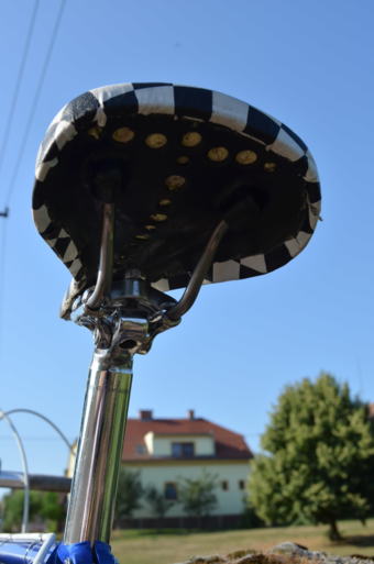 Sedlo – odvrtané a přečalouněné do šachovnice. Motivací mi byli šachovnicové lepicí pásky, často se vyskytující na starých Favoritech.
