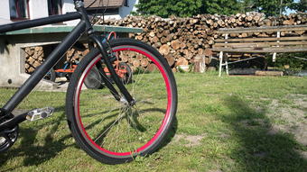 Kola jsou předělána na bezduše. Použil jsem klasickou Tesu 4289 (protože jí mám ještě asi 60 metrů) místo normální pásky do ráfku, na utěsnění a ventilky pak rozříznuté 20" duše (koupené ve výprodeji za asi 35 Kč/ks). Nahozeno kompresorem napoprvé, o malou netěsnost u ventilku se postaral Caffélatex (nalito asi 60 ml do každého kola).