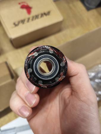 - Říjen 2025 – Takže kolo mě teď hrozně začalo bavit, kotoučovky na trialu jsou prostě boží, brzdí to jako kráva a zároveň je to tiché! Takne Single Speed Čínskej náboj maká skvěle, ale já zatoužil opět zaexperimentovat a pořídit nějaký lehčí kousek..:-) Na Ali jsem narazil na novinku pro rok 2025 – ARC MT088 – celkem se mi líbila konstrukce, do toho padly nějaké slevičky a náboj za 40USD byl doma! Váha je krásných 299g, to je prostě paráda. Není to bohužel Single Speed, ale klasický náboj s hliníkovým HG ořechem o rozměru 10×135mm, takže výplet není symetrický a předěl ořech / tělo náboje je víc uprostřed – větší namáhání ložiska a krut osy. Převrtal jsem QR koncovky na 12mm, použil jsem plnou 12×135 na 10×135 redukční osu na M6 šrouby, to by mělo zvýšit tuhost vnitřní osy náboje, snížit možnost nepřesného zapadání praporků a rizika zlomení vnitřní osy. Náboj má uvnitř pěkně široký ráčnový kroužek velkého průměru o 90 zubech, je tak menší šance na protočení kroužku v těle náboje, praporky používá dvouzubé, ale o šířce 7,45mm! Celkem 6 praporků pracuje ve dvou skupinách po třech, klasika, celkem 180 poloh záběru, což je prostě velká paráda a hrozně návyková věc! Navíc při případném přeskočení zubu se ozve jen rána a prošlap je téměř neznatelný. Zvuk náboje je oproti Tanke Single Speed o hodně příjemnější, tišší. Hmotnostný rozdíl i se započtenou redukční osou je 100g, dalších 100g jsem shodil na ráfku – napleteno na osvědčený Spank Spike Race 33. Pár jízd proběhlo, občas v tom luplo, jinak maká skvěle, tak snad nebude zlobit. Má hrozně hladkej chod, minimální odpor a je tišší jak Tanke! Tak uvidíme, jak bude šlapat ..