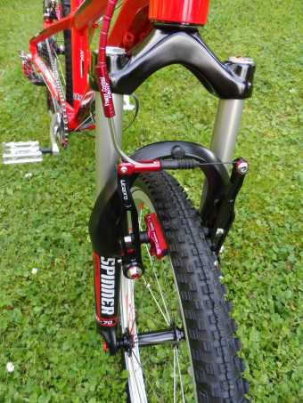 Ostatní věci jsou koupený z Číny, nebo bazarovky. Pedály mají odfrézovyný klece a osy jsem dal CrankBrothers, pokrácený o 15mm a odvrtaný. Na brzdový ramínka jsem navěsil upravený silniční brzdový botky, jsou tam Alu upravený šrouby a titanový matky. Karbonový řidítka a sedlovka pokrácený, nějakej ten elox… Nová lehká sedlová objímka s titanovým šroubem, titanový šrouby samozřejmě i v představci. Vedení lanka od řazení z levý strany dolní rámovky na pravou stranu středový mufny jsem vyřešil vodítkem lanka pod košíkem. Řazení jsem dal Sram X.7, grip nemá tak velkej průměr jako X.0 a je naopak delší, pro dětskou ruku myslím vhodnější. Řetězová linka nakonec vyšla na výbornou, řetěz je v ose na pátým kolečku. Q faktor jsem moc neřešil, vlastně to ani moc řešit nešlo, když jsem chtěl tyhle kliky.