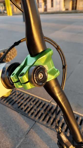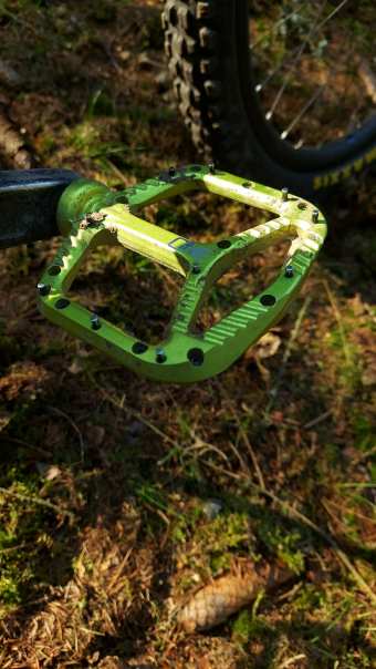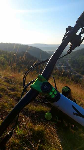 Funkčně už tam nebylo moc co vylepšovat, povedlo se mi nalomit jinak výborný plastový pedál Bontrager Line Elite což odstartovalo posun estetické stránky kola. Zeleně eloxované OneUp platformy brzy doplnil představec Unite Components britské výroby. deseti různýma polohama objímek a nespočetnými pády ošoupané původní RF Aeffect řidla jsem chtěl také poslat pryč a trochu jsem se zahleděl do titanových 35mm Kingdom Sparta řídítek, které podle původního plánu měla doplnit možná taktéž titanová stříbrná pružina. Bohužel z řídítek sešlo, dosud nejsou dostupná, a tak je zastoupila uhlíková řídítka OneUp za velmi pěknou cenu. Stříbrný péro nebude, možná bude nějaká černá nebo „patinová“ LS pružina, EXT V2, co? :-), ať to kolo má aspoň pod 15,5kg. Jinak už vážně není moc co vymýšlet, pár zelených šroubků, objímka sedlovky?.. Maličko tam někde vzadu vrtá teleskop s většim zdvihem, mám tam místo na 180–190, ale to jedině že by zdechnul Reverb, a on ne a ne, běhá furt jak po másle.