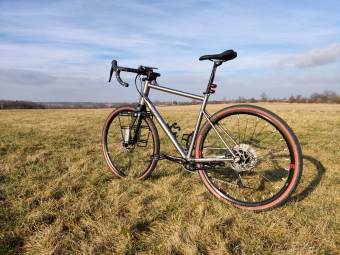 Koupeno 09/21, ale vyrakvený rameno mi vystavilo stopku až do listopadu. Řídítka, sedlo a sedlovka převzaty ze starého gravelu hned. Proběhlo pár vyjížděk a už padlo zimní bláto, tak začal servis. Standardní komponenty nejsou top hitparáda, ale jde to. Jen kliky 172,5 byly hodně špatný vtip. S trochu kratším řetězem funguje i 11–46z kazeta, odezva na řazení skoro lepší než předtím. Celokarbonová přední vidlice funguje dobře a titanový rám s dlouhou karbonovou sedlovkou je vlhký sen zapáleného gravelisty. Ozývaly se hlasy, že zadní stavba je nedostatečně tvarovaná, ale ty vzpěry mi i jen přes palce propruží, takže jsou ok. Při hodně silových záběrech už je cítit houpání (85kg). Je dobře, že na zadní stavbě nejsou závity pro nosič, už by tam byl narvaný. Kola jsou pro běžné ježdění dostačující a dráty zatím drží napětí rovnoměrně. Na zimu nechávám origo pláště a od manželky platformy. Na jaře dávám klipsny a nahodím osvědčené Continental Terra Speed nebo zkusím levnější Tufo Speedero. Hutchinson Touareg sice dobře drží na ledu a v měkkém, ale pro moje ježdění jsou poměrně tvrdé a bordelu se nechce ze vzorku ven. Hmotnost příslušenství je tvrdou měnou, za světla, stojánek, přední nosič a telefon to bude určitě přes 1,5kg. Supacaz je ok, ale doporučil bych ji, kdyby byla o min. 10cm delší. Sumárum za 60k se nedějí zázraky ani v Dekáči a po úpravičkách už zavládla velká spokojenost.