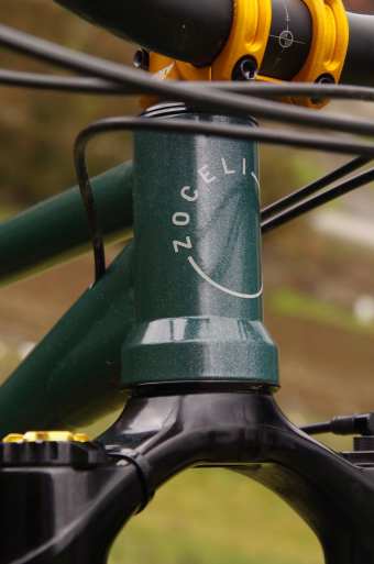 Rám je předprodukční, takže nemá stejnou geometrii jako později na stránkách Zoceli prodávaný „sériový“ rám Natvrdo. S nastavením vidlice na 140 mm mi úhloměr telefonu ukazuje hlavovej úhel asi 65,5 stupně, efektivní sedlovej bude bez sagu přes 75. Po výměně představce se geo od Trance 29 (oboje v sagu) vlastně zas tak neliší, na Zoceli jsem v sedle trochu víc nataženej.