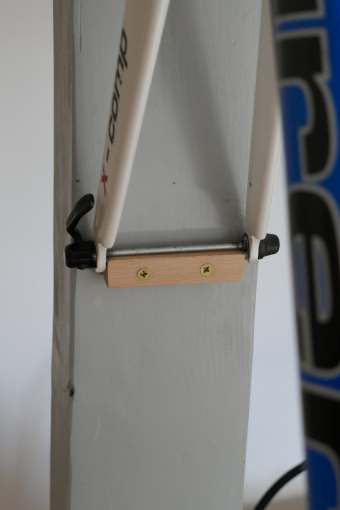 Jakube, ale to je omyl! Není to NAD HLAVOU! Je to za postelí dobrých dvacet cenťáků, musíš zaklonit hlavu, abys na něj viděl. Takže kdyby to spadlo, přistane mi na hlavě jenom půlka řidítek :-D A nepřekáží ani trochu, naopak opticky vyplňuje úplně plonkovej prostor, kam se nechodí. A to ukotvení – no dobře, tak pojistím tu přední osu na tom hranolku. Pak už to bude naprosto neprůstřelný.. bude to tak v pořádku? ;-)