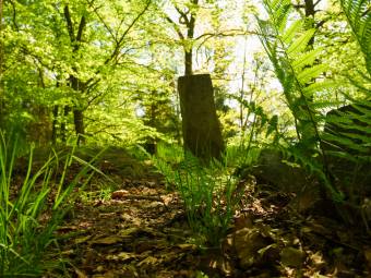 Kapradím upozaděný středový menhir lovčického kruhu.