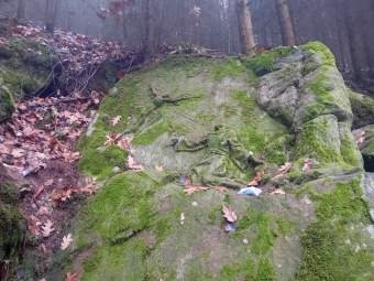 Reliéf sv. Františka z lesa směrem k betlému. Betlém samotný byl den před tím trochu zklamáním pro děti.. Nevěděli jsme že je tam poničený. Sic tedy dílo to je pěkné