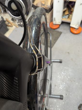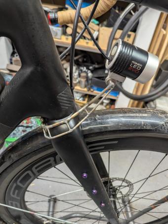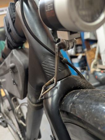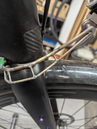 Bo vidla neni provrtana skrz a chtel jsem si na kolo dat druhe svetlo s externi baterkou, tak jsem si vyrobil drzacek z pětky dratu. Ale dost se svetlo trepalo, tak jsem se rozhodl, ze to zkusim trochu zpevnit. Musi to byt tak blbe tvarovane, aby slo otacet riditkama. Hlavni drat 5mm, spodni 3mm, vyztuhy 2.5mm. Neni to stopro tuhe, to bychnto musel udelt oboustranne, ale trepani je podstatne lepci.