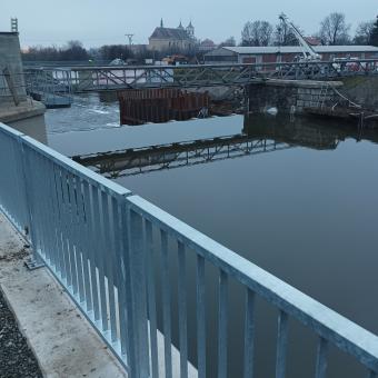 Rekonstruovaný splav u Rajhradu a v pozadí klášter. Zataženo.